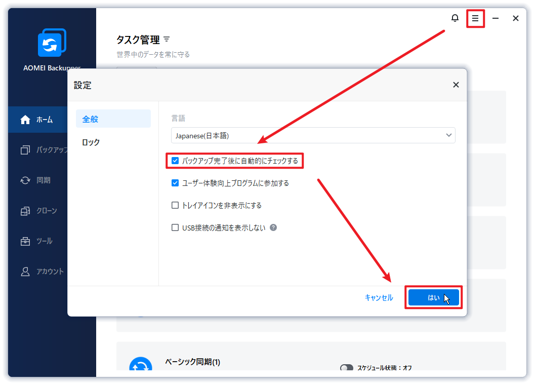 バックアップ完了後に自動でバックアップイメージの整合性を確認することも可能です(推奨)。その場合は、ツールバーのメニューアイコン→「設定」→「バックアップ完了後に自動的にチェックする」オプションを有効にしてください。