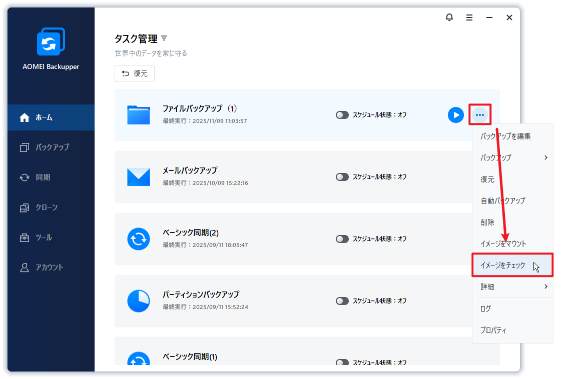 AOMEI Backupperを開き、「ホーム」タブで検証したいバックアップにカーソルを合わせ、縦三点アイコンをクリックして「イメージをチェック」を選択します。