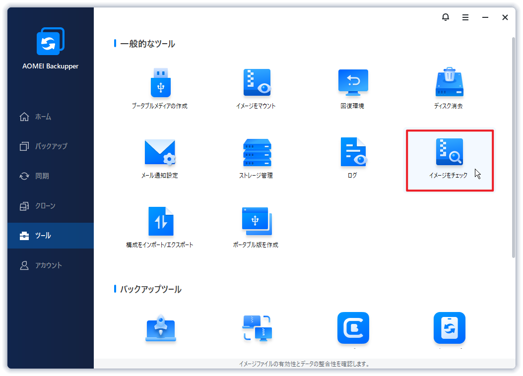 または、「ツール」→「イメージをチェック」をクリックし、検証したいバックアップイメージを保存先から直接選択することもできます(「ホーム」タブにバックアップタスクが表示されていなくても、個別のバックアップイメージをチェックすることが可能です)。