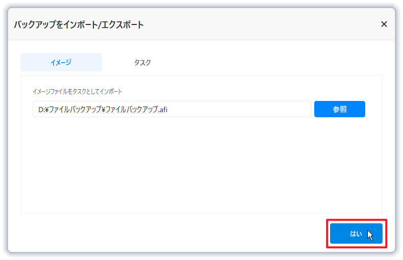 バックアップイメージがある場合、「参照」ボタンをクリックしてバックアップ保存先からイメージファイル(.adi、.afi)を選択し、「はい」をクリックします。これによりバックアップタスクが復元され、「ホーム」タブにバックアップタスクが一覧表示されることを確認できます。