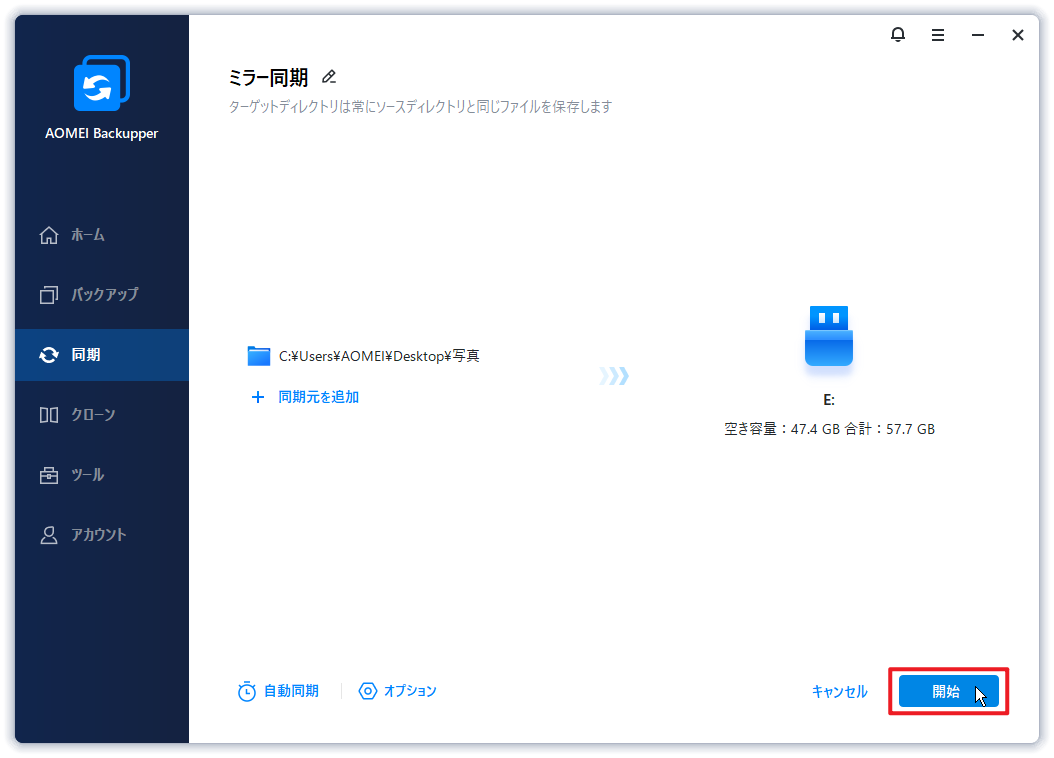 4. 最後は問題なければ「開始」をクリックしてミラー同期を実行します。
