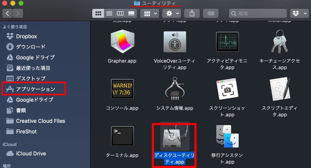 「Finder」>「アプリケーション」>「ユーティリティ」>「ディスクユーティリティ」にアクセスします。左側のリストから外付けドライブを選択し、右側のパネルで現在のファイルシステムを確認してください。