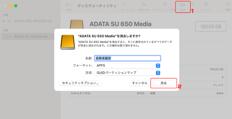 外付けHDDをMac互換のファイルシステム(APFS、HFS+、FAT32、またはexFATなど)に再フォーマットするには、ディスクユーティリティ内で該当ドライブを選択し、「消去」ボタンをクリックします。その後、希望するファイルシステムを選び、操作を確認するために再度「消去」をクリックしてください。
