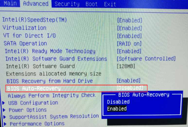 3. 「Advanced」タブで「BIOS Auto-Recovery」を「Enabled」に設定し「Enter」キーを押します。