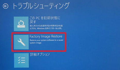 2. 「トラブルシューティング」⇒「Factory Image Restore」(工場出荷時のイメージの復元)をクリックします。