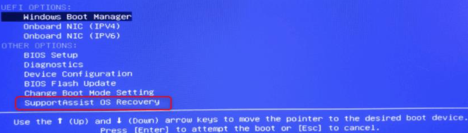 5. 次の画面が表示されたら、「SupportAssist OS Recovery」を選択し、「Enter」キーを押します。