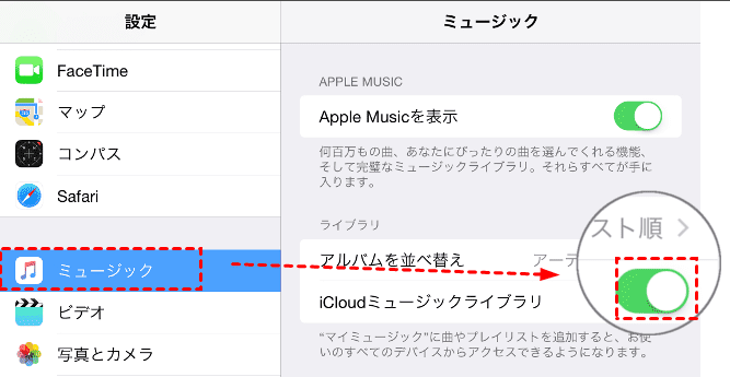 具体的には:iPhoneで「設定」を開く>「ミュージック」をタップ>「iCloudミュージックライブラリ」のチェックを外してオフにします。