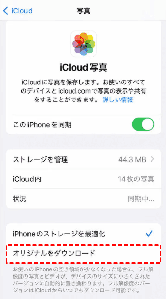 手順2.iCloud写真にある「オリジナルをダウンロード」を選択して、デバイス本体に写真とビデオを保存します。