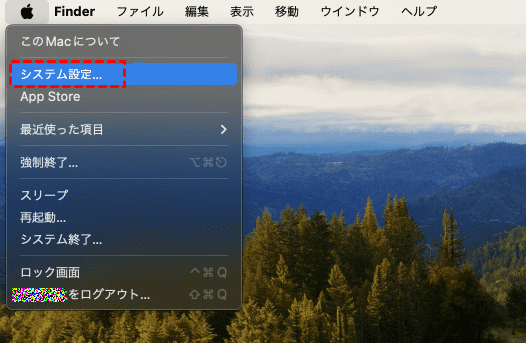 手順1.デスクトップから左上隅にあるAppleのアイコンをクリックして、「システム設定」を選択します。
