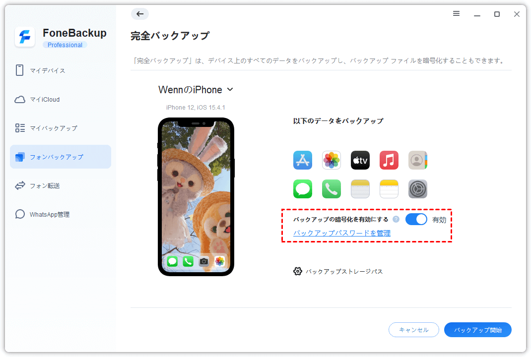 手順2.「フォンバックアップ」に移動>「完全バックアップ」を選択して、「バックアップ開始」ボタンをクリックします。