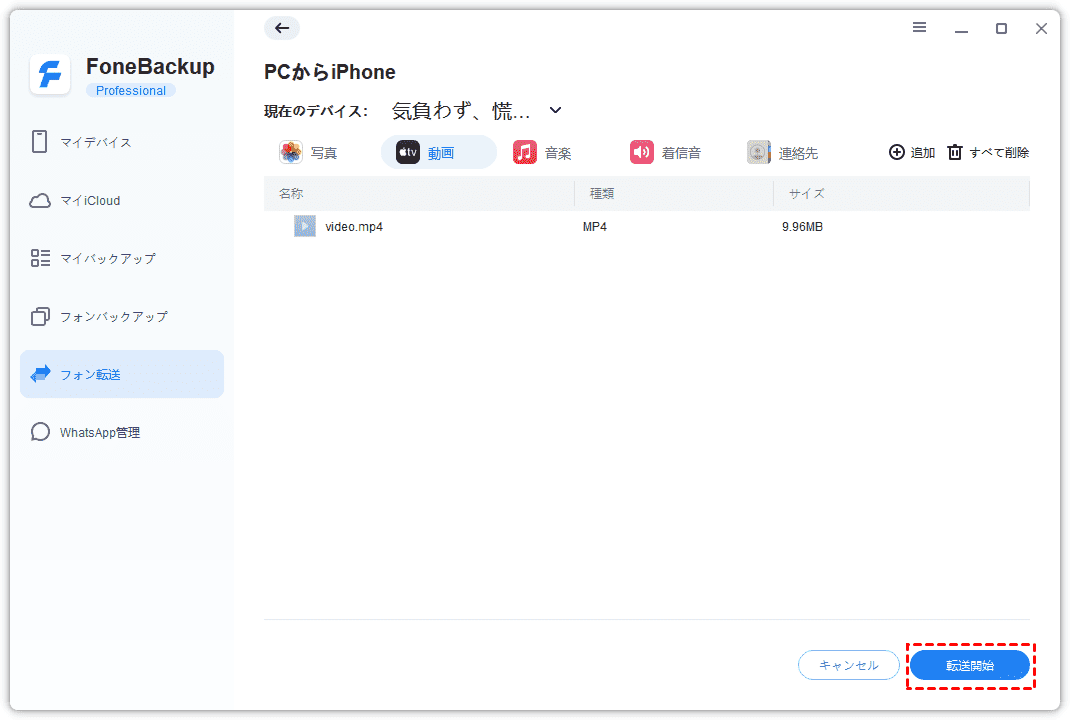 手順 2. 「フォン転送」をクリックし、マウスを「PCからiPhone」に移動し、「転送開始」を選択します。