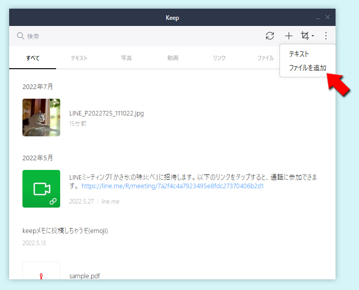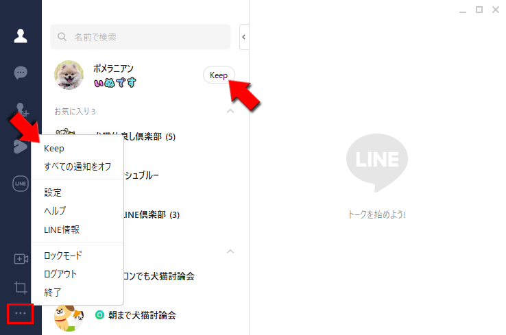 手順 1. PCでLINEを開きます。左下にある「…」アイコン→「Keep」を選択し、または自分の名前の横の「Keep」をクリックして「Keep」を開きます。