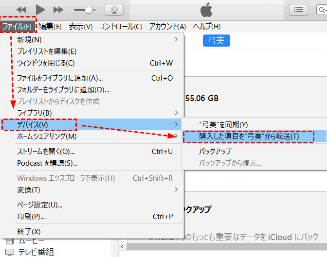 手順2.「ファイル」 > 「デバイス」 > 「購入した項目を(iPhoneのデバイス名)から転送」の順にクリックします。