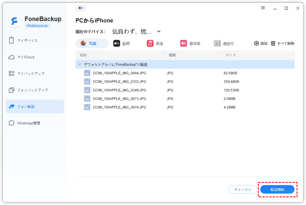 ステップ 2. 「フォン転送」→「PCからiPhone」の「転送開始」ボタンをクリックします。