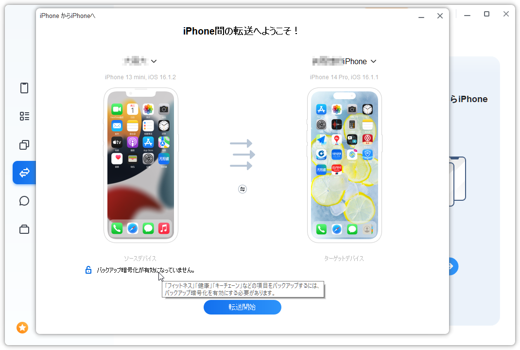 ステップ2:転送元と転送先のデバイスがリストされます。バックアップの暗号化を有効にして、ソースデバイスのデータを暗号化できます。