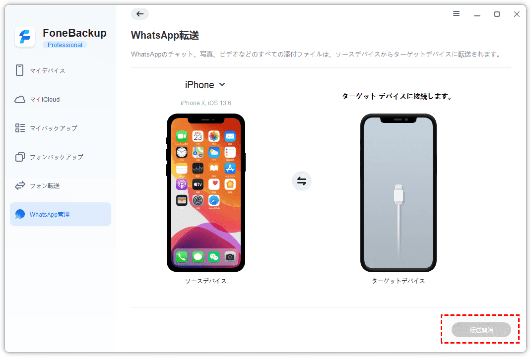 ● 転送後、転送先デバイスのWhatsAppデータは上書きされます。