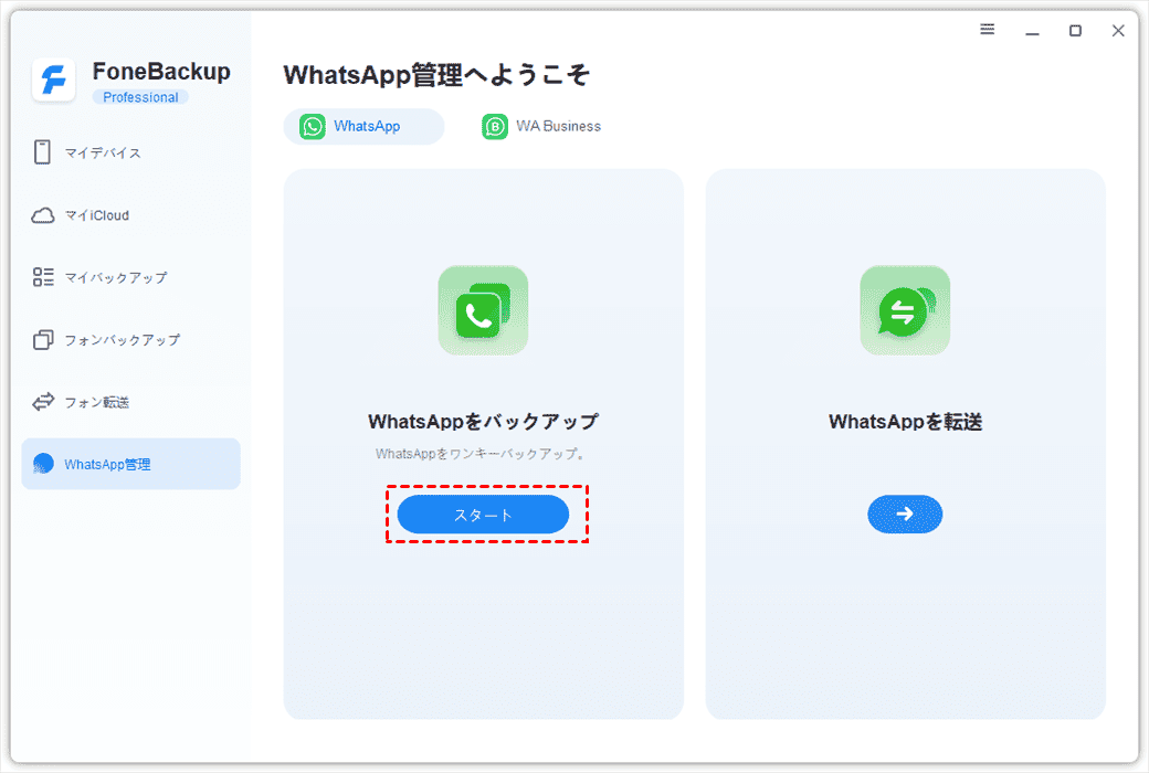 ステップ 1. AOMEI FoneBackupを起動し、左メニューバーの「WhatsApp管理」をクリックします。そしてアカウントの種類によって「WhatsAppを転送」又は「WhatsApp Businessを転送」を選択します。