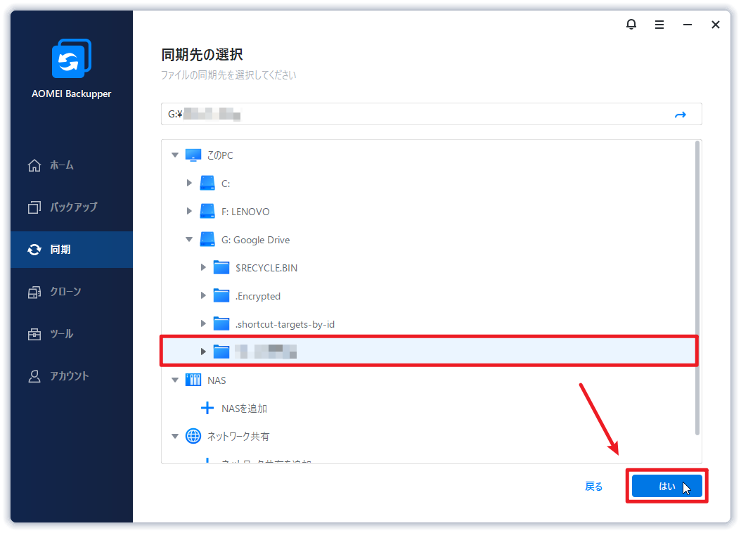 ステップ 3. 同期先をクリックします。保存先としてGoogleドライブを選択し、「はい」をクリックします。