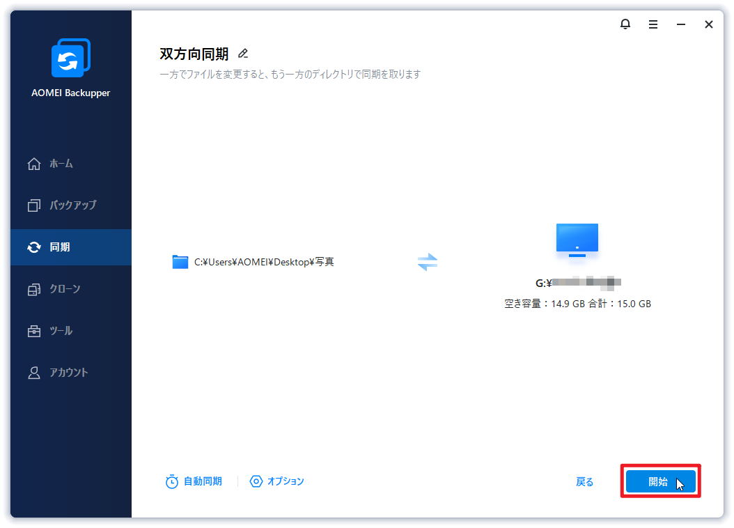 ステップ 4. 需要に応じて自動同期を有効にすることができます。最後に、操作を確認し、問題がなければ「開始」をクリックします。