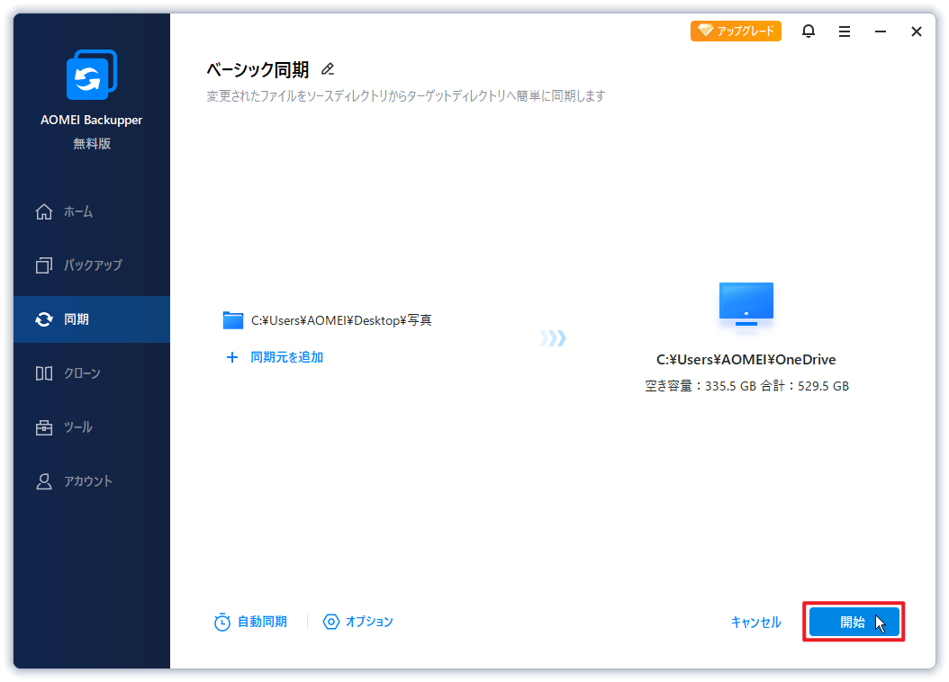 OneDriveの同期に関するエラーや同期の遅延などの問題が発生した場合、無料のファイル同期ソフトウェアであるAOMEI Backupper Standardを利用することで、簡単にドキュメントをOneDriveと同期できます。以下にその利点を示します: