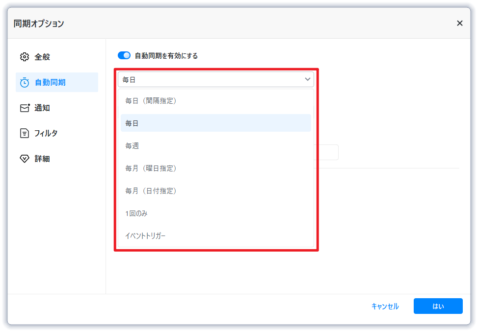 手順 4. 双方向同期を自動的に実行するには、下部にある「自動同期」をクリックし、適切な同期頻度を選択します。