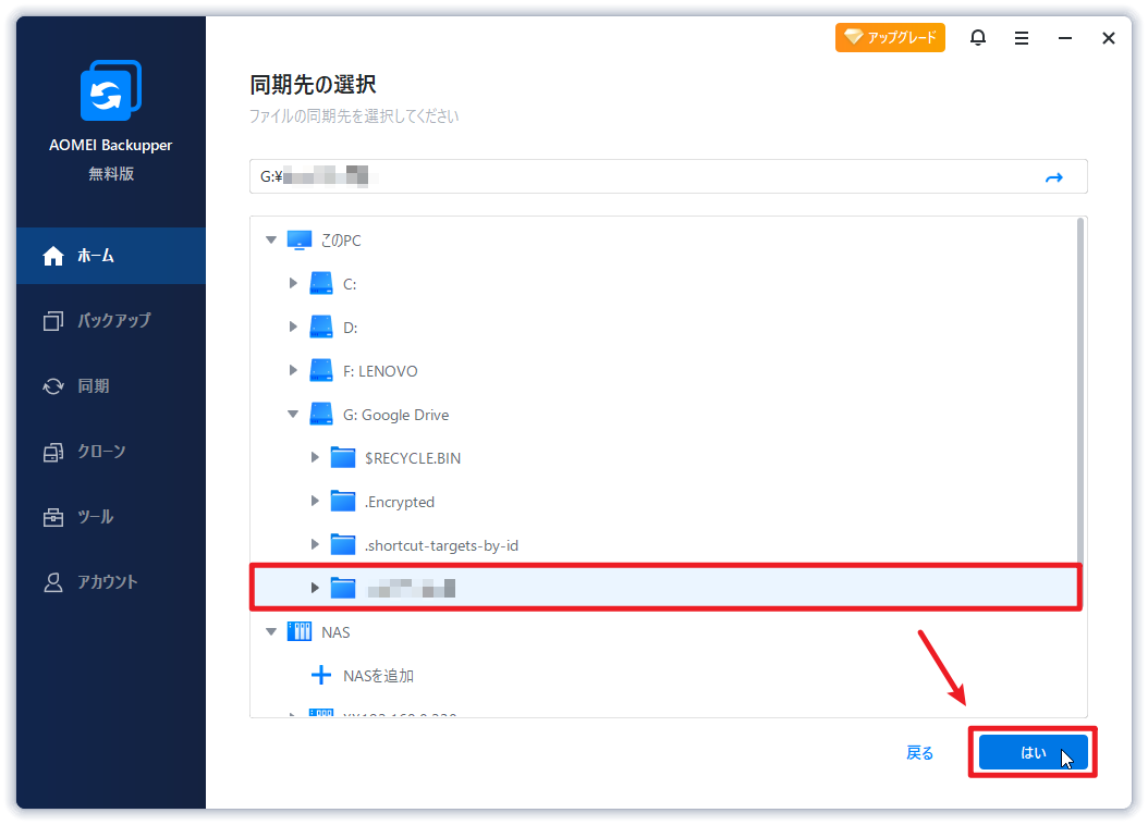 手順 4. 「ネットワーク共有を追加」または「NASを追加」をクリックします。そしてパスを入力し、同期するネットワークフォルダを選択し、「はい」をクリックします。
