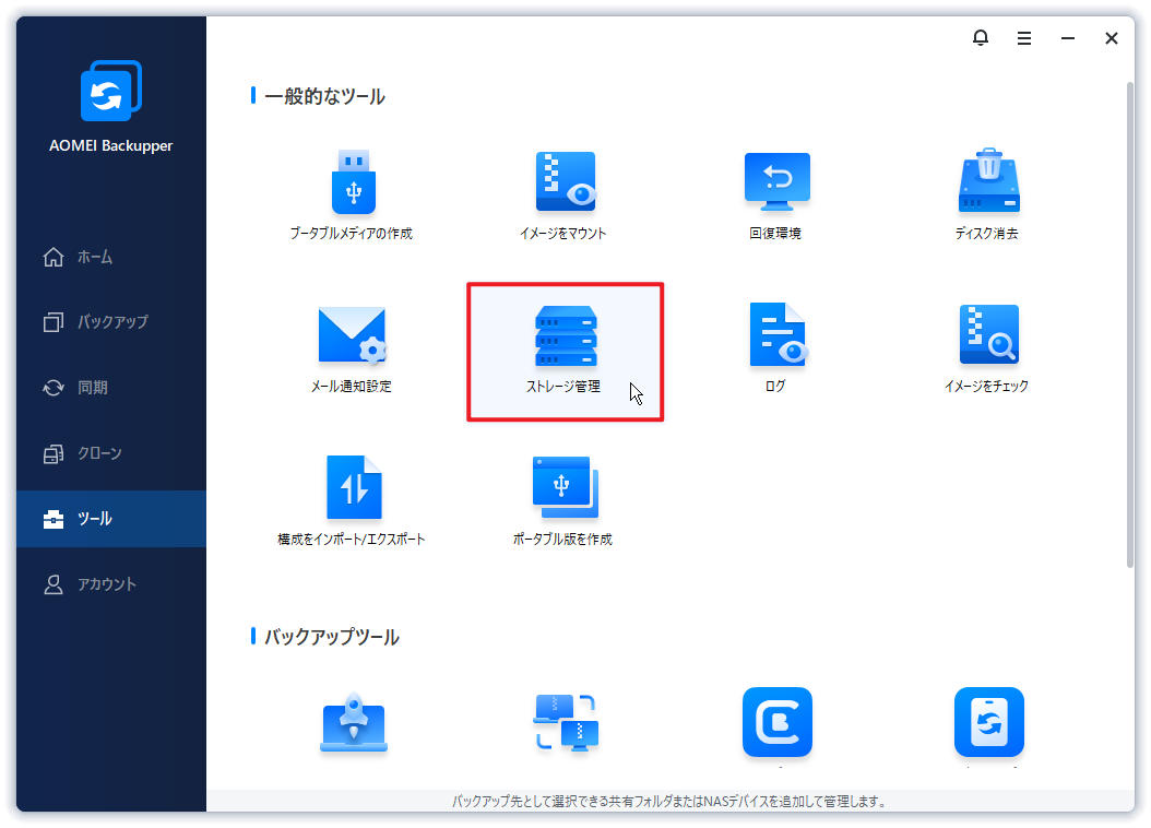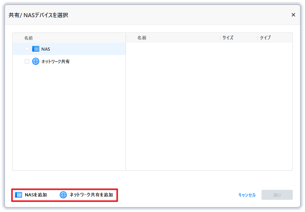 ▶※異なるNASデバイスの同期タスクを既に作成している場合には、「ツール」⇒「共有/NASデバイス管理」に移動してNASをうまく管理することができます。