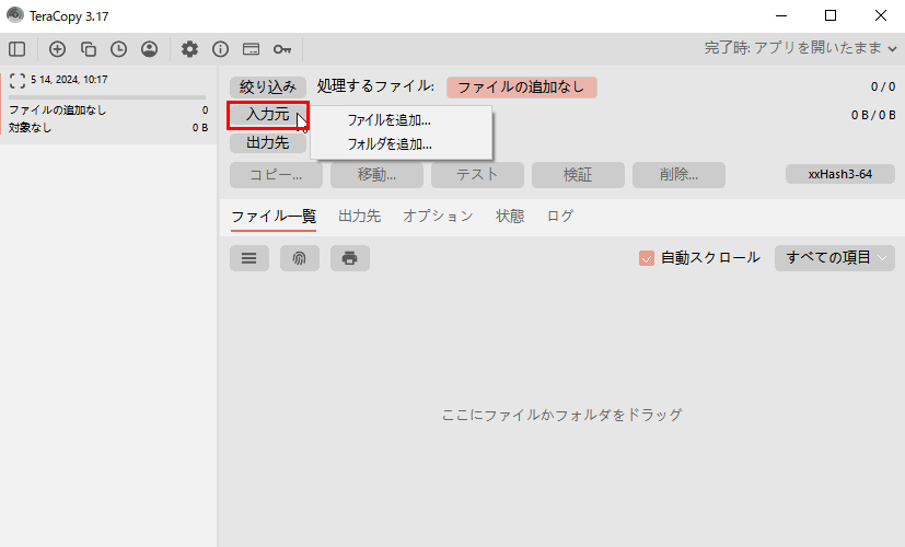 ステップ 2. 「入力元」をクリックし、「ファイルを追加」または「フォルダを追加」を選択し、転送したいアイテムを選択します。