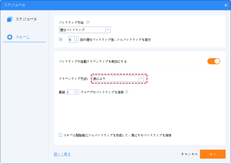 そして、「スケジュール」の「バックアップスキーム」タブに移動し、「バックアップの自動クリーンアップを有効にする」スイッチをオンにし、バックアップファイルの自動削除を有効にします。「数」「時間」「日数、週数、月数」の3つのクリーンアップ方式から1つを選択します。ちなみに、バックアップを手動で削除したい場合は、エクスプローラーで行います。