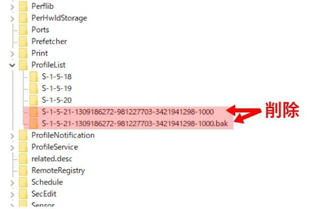 SIDが2回リストされている場合は、.BAK拡張子のないフォルダーを削除できます。