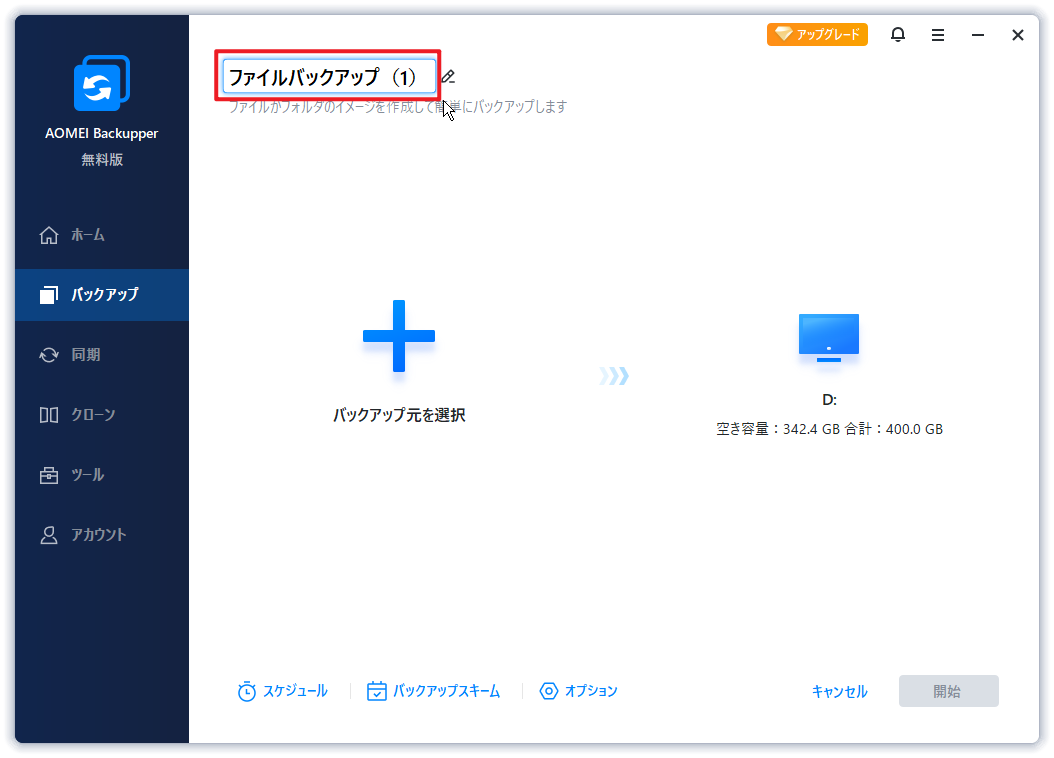 ノート:時間とストレージスペースを節約できる増分バックアップと差分バックアップの機能も備えています。また、Professional版にアップグレードすると、バックアップスキーム、ユニバーサル復元などのより高度な機能を使用できます。