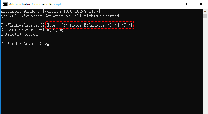 ▶ Xcopy C:\Photos E:\Photos /E /H /C /I