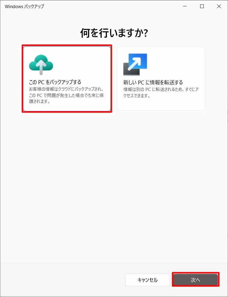 ステップ 2. 「このPCをバックアップする」を選択し、「次へ」をクリックします。