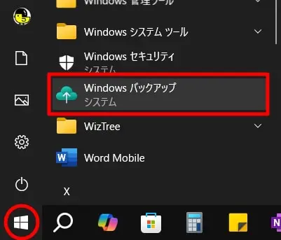 ステップ 1. スタートアイコンをクリックし、「Windowsバックアップ」を選択します。