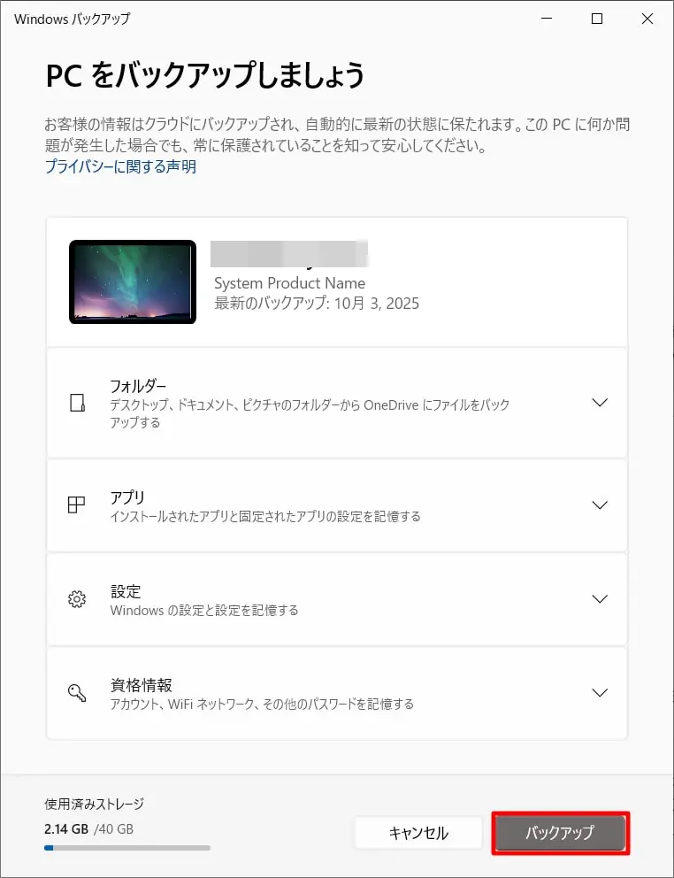 - Windowsバックアップを有効にする:設定からクラウドにデータを同期するWindowsバックアップを有効化します。