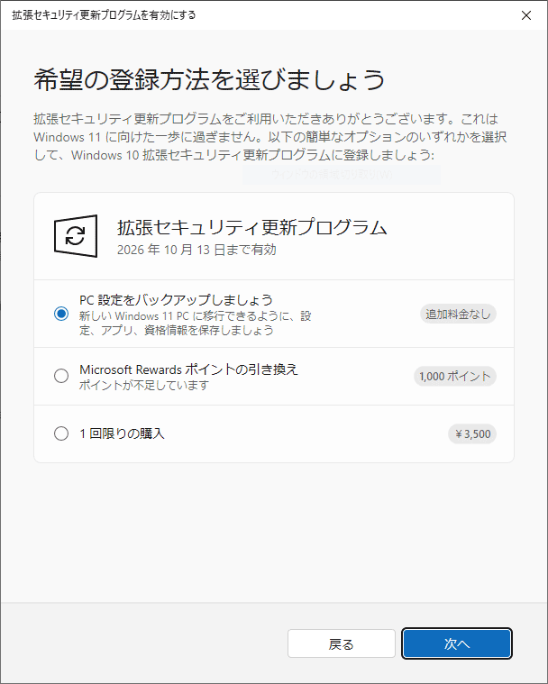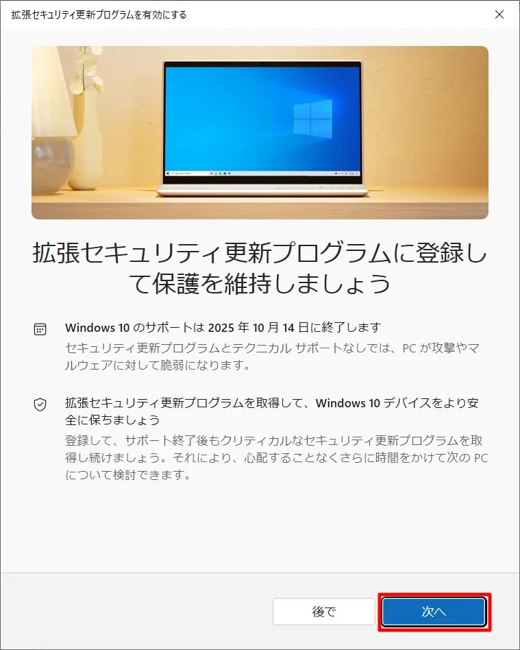もし、すぐにWindows 11へアップグレードできない場合は、Microsoftが提供する「拡張セキュリティ更新プログラム(ESU)」を利用することで、1年間のセキュリティ更新を受け取ることも可能です。