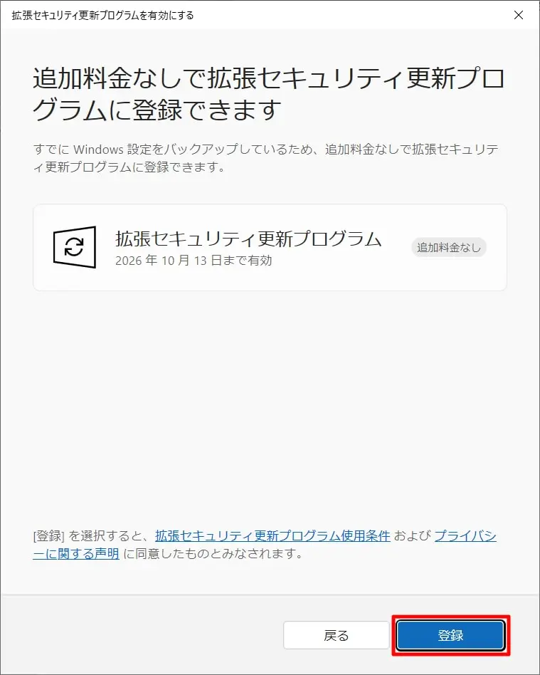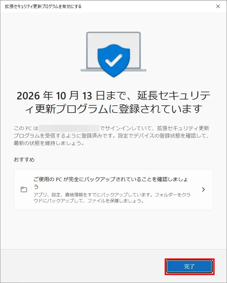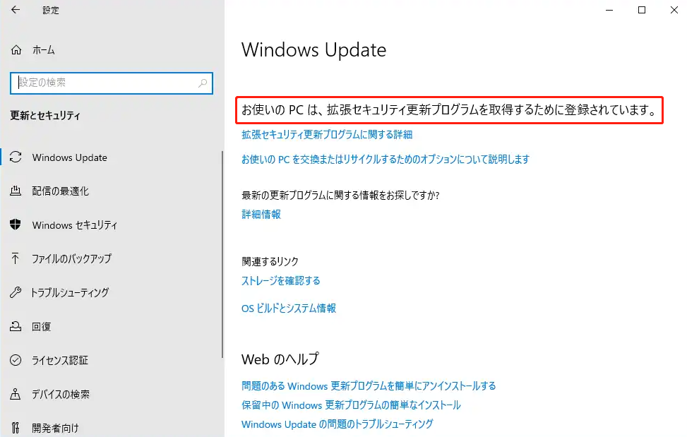 「Windows Update」の画面に戻り、「お使いのPCは拡張セキュリティ更新プログラムを取得するために登録されています。」と表示されていることを確認します。