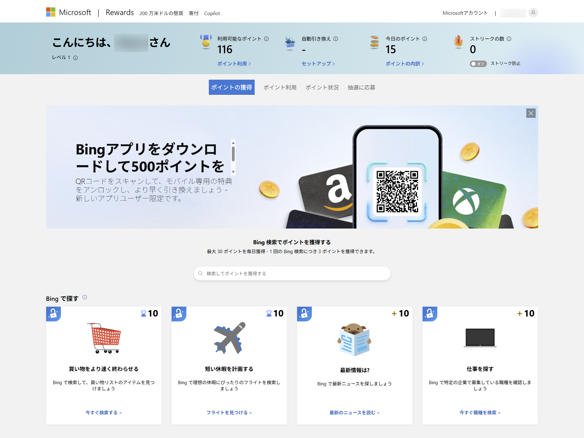 ステップ 4. モバイル版Bingアプリでの500ポイントと、検索などで貯めた500ポイントを合わせて1,000ポイントに達したら、ESUと引き換え可能です。