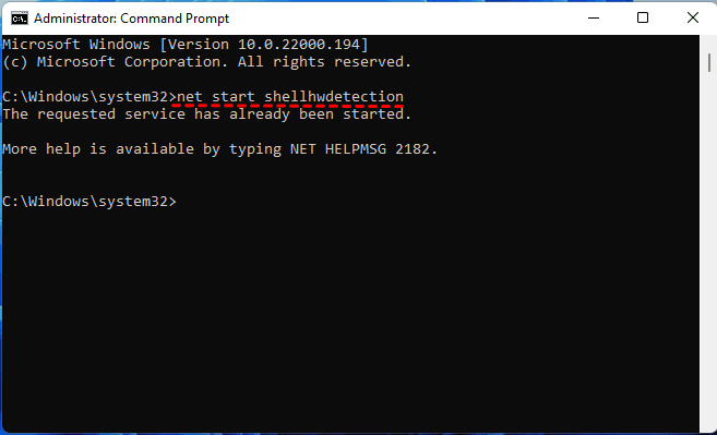 2. 「コマンドプロンプト」ウィンドウで、「net start shellhwdetection」と入力し、「Enter」キーを押します。コマンドが正常に実行されるまで待ち、パソコンを再起動します。