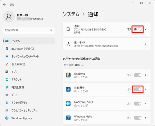 1. 「Windows」+「I」キーを押して、「Windowsの設定」を開き、「システム」タブ→「通知」をクリックします。