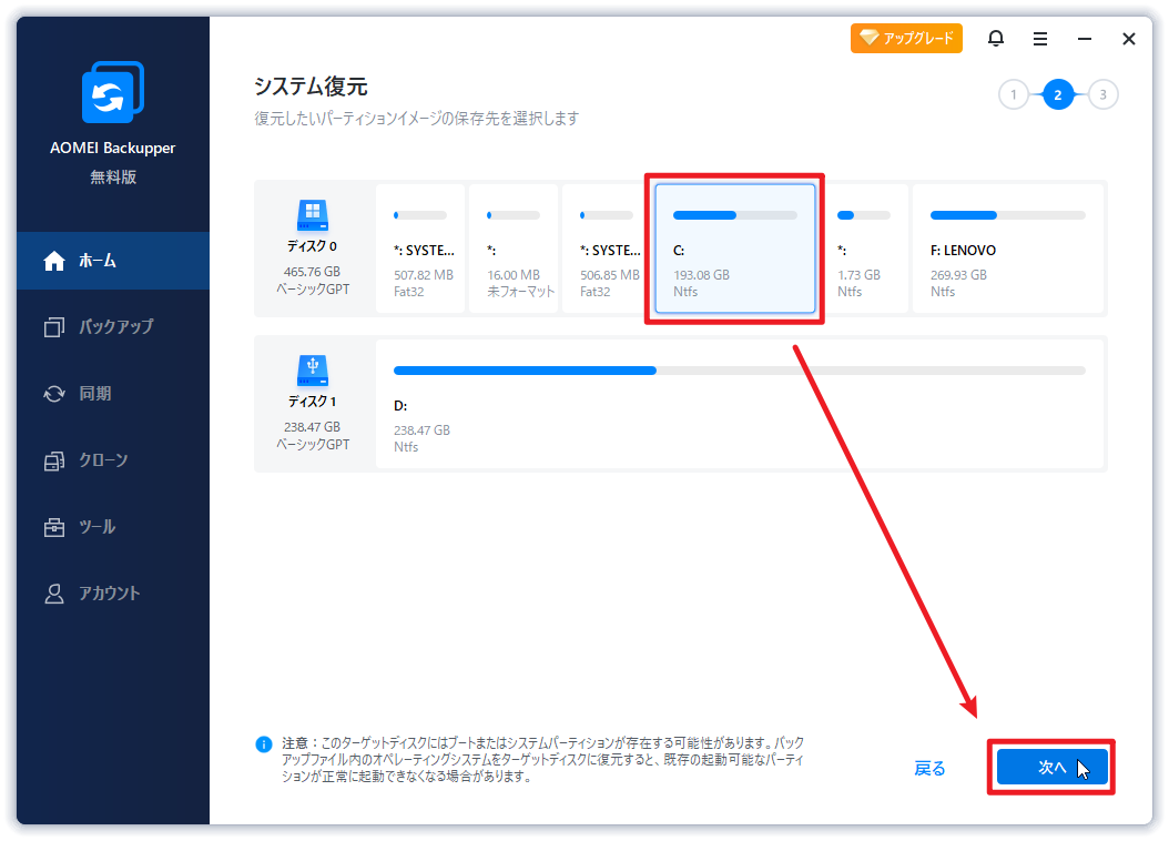 手順 3. このプログラムはシステムドライブに関する全てのパーティション(システムで予約済みのパーティションなど)を自動的に選択するので、バックアップ先だけを選択する必要があります。
