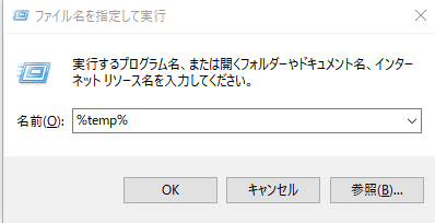 手順1. Win+Rキーを押して、「ファイル名を指定して実行」コマンドを起動します。テキストフィールドに「%temp%」と入力し、「OK」を押します。
