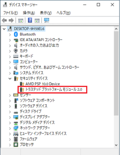 手順 2. 「デバイスマネージャー」が表示されます。「セキュリティデバイス」の左側にある三角をクリックし、「トラステッド プラットフォーム モジュール 2.0」の表示の有無を確認します。