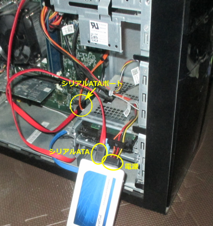 PCの電源を切った状態で、ケースを開けて新しいSSDをPCに接続します。背面部分のコネクタにシリアルATAケーブルと電源ケーブルを接続します。まずは、シリアルATAケーブルをマザーボードのシリアルATAポートに接続します。ポートの場所は既に接続されているドライブからシリアルATAケーブルをたどっていくと見つかります。接続が終わったらPCを立ち上げます。