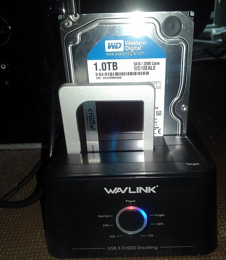 スタンドを使う場合は、Source(手前のスロット)にHDD、Target(奥のスロット)にSSDを挿してから、USBをPCに、電源をコンセントに接続してから背面にあるスイッチを入れます。
