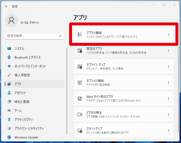 1. 「Windows」+「I」キーを押して「設定」を開き、「アプリ」→「アプリと機能」をクリックします。