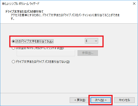 6. ドライブ文字を設定し、「次へ」を押して次に進みます。