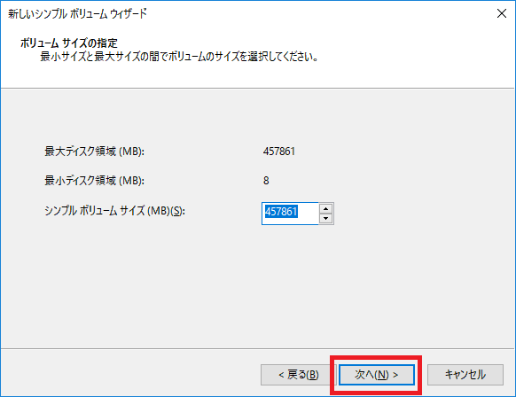 5. 「新しいシンプルボリュームウィザード」が開いたら、「次へ」をクリックします。次に、「シンプルボリュームサイズ」を「最大ディスク領域」と同じに設定し、「次へ」をクリックします。