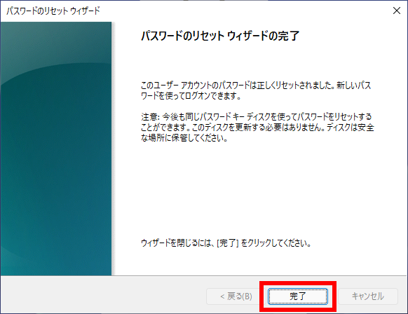 ステップ 6. 次のウィンドウで、「完了」をクリックし、パスワードリセットディスクをパソコンから取り出します。これで、新しいパスワードでWindows 11にログインできます。