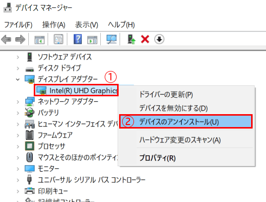 2. 「ディスプレイアダプター」をダブルクリックして展開します。「Intel(R) Graphics Driver」を右クリックし、「デバイスのアンインストール」を選択します。